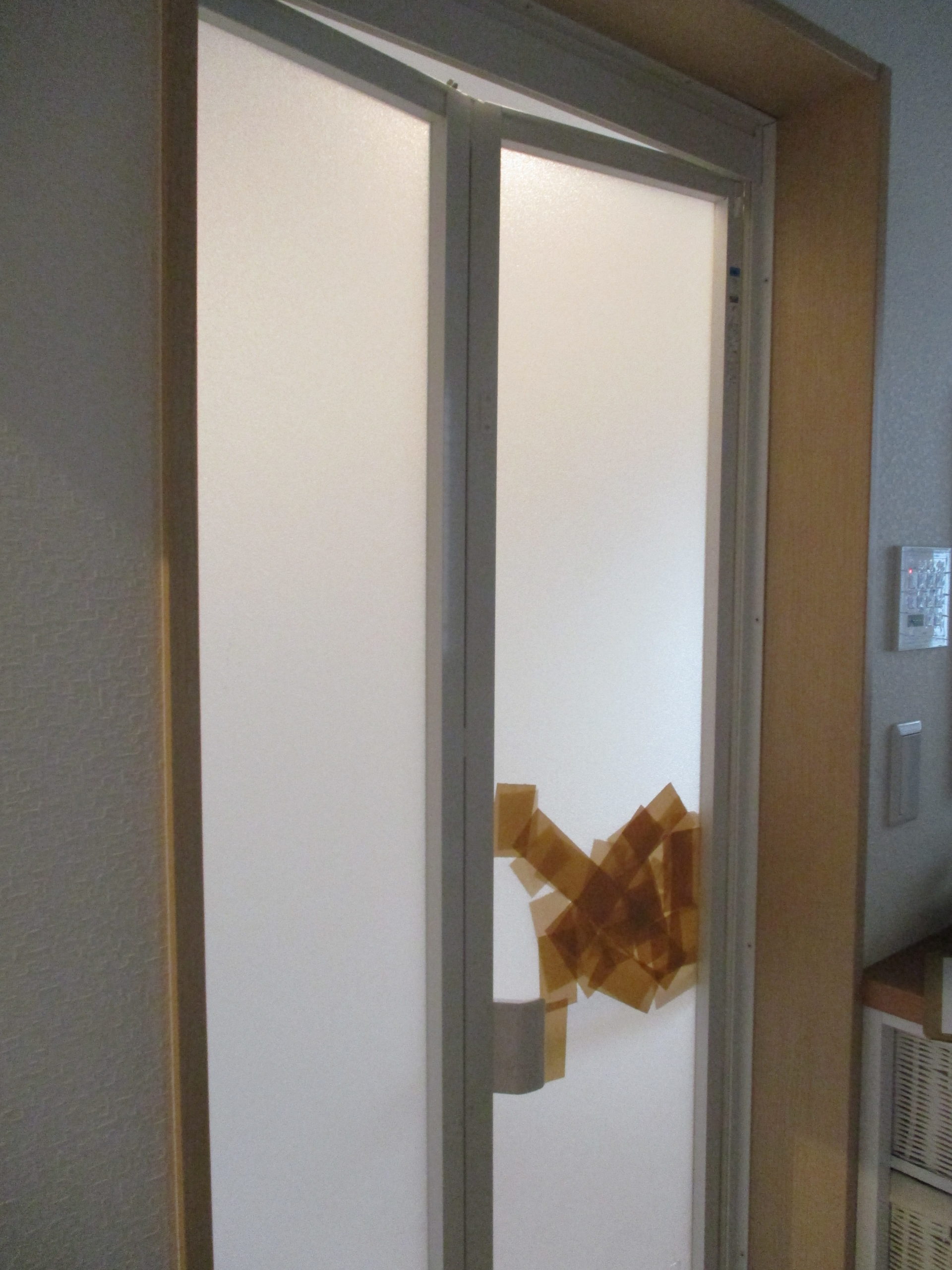施工前 衝撃によって無残に割れてしまった浴室折戸のパネル