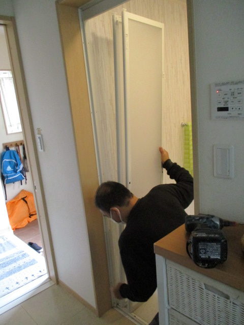 施工中 新しい扉の吊り込みと取っ手の取り付け工程