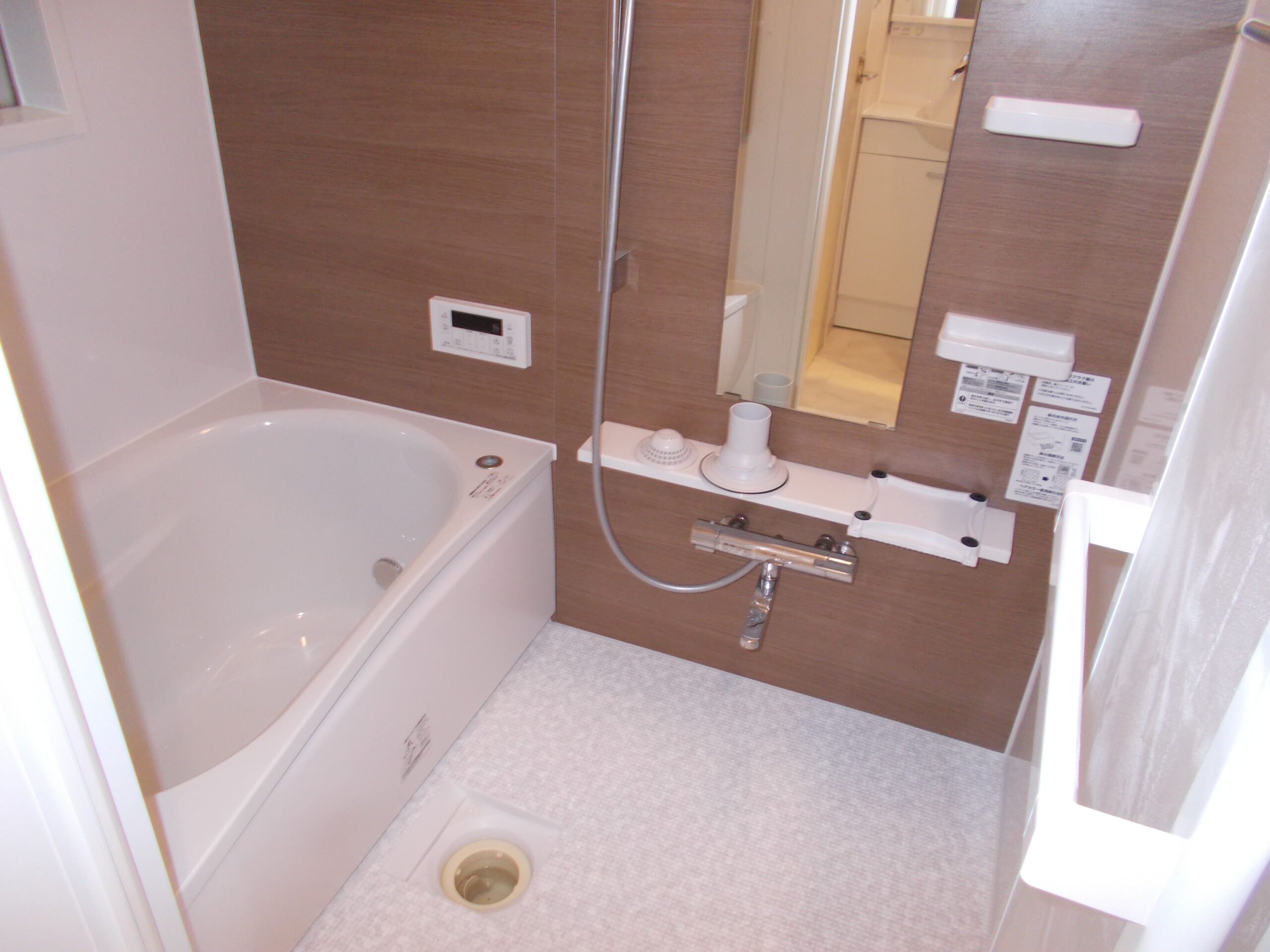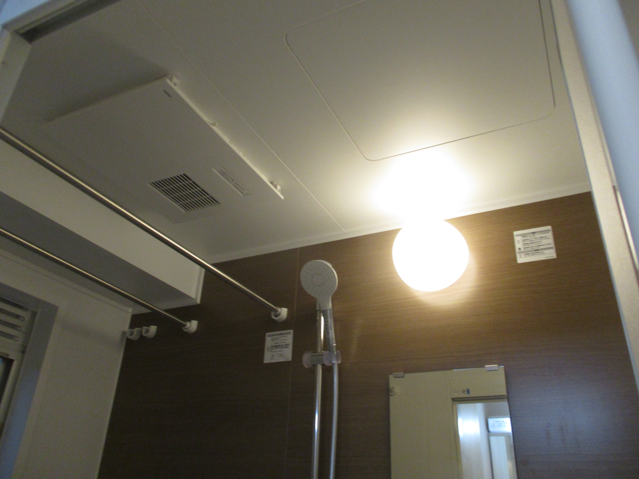 そして天井には、もう一つの最新設備である浴室乾燥機を新設いたしました。浴室乾燥機は、入浴後の浴室内の換気を行ってカビの発生を強力に抑えるだけでなく、温風を出して衣類を乾燥させたり、入浴前に浴室全体を暖めておいたりする極めて優秀な多機能設備です。