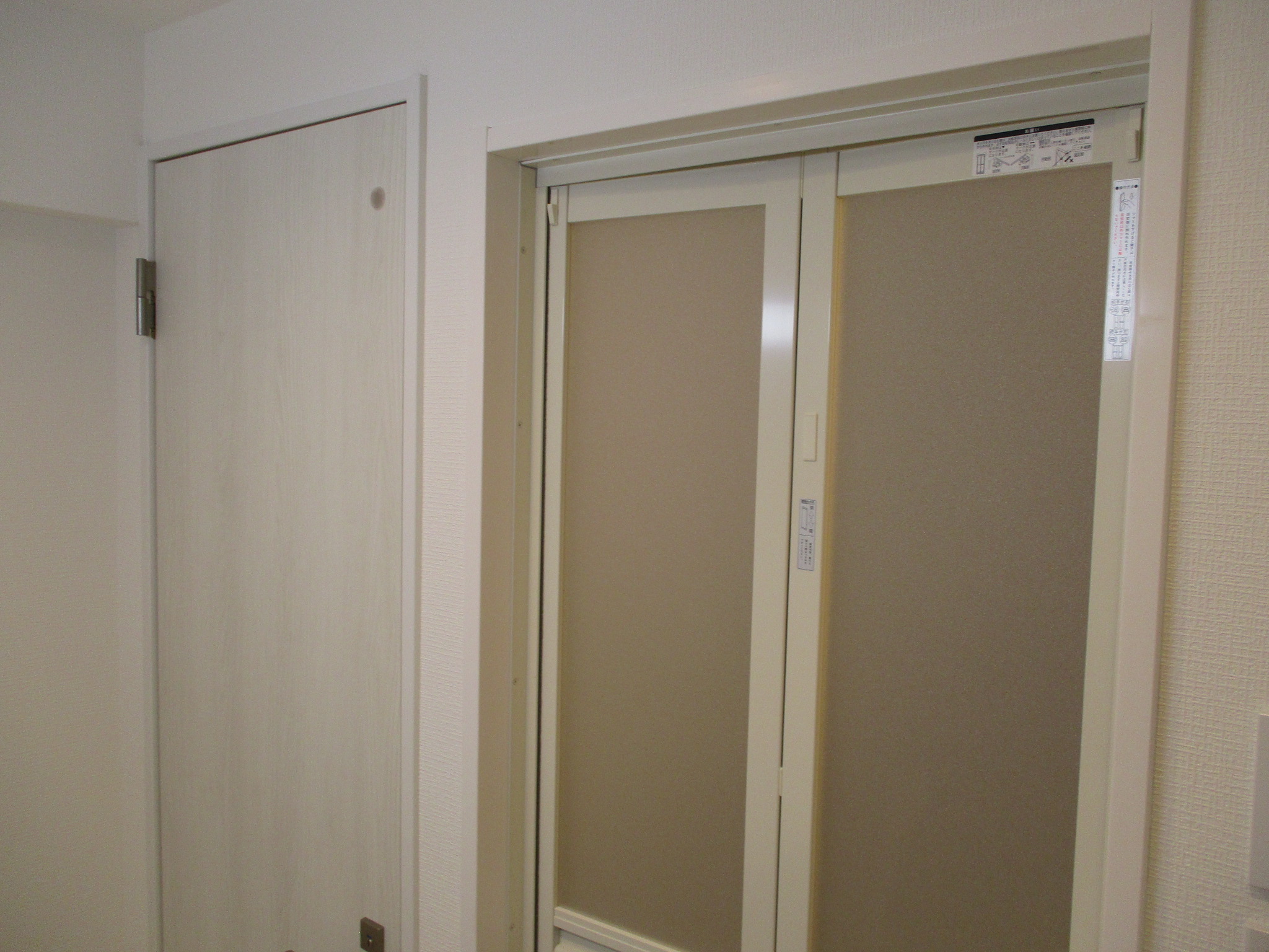 古い開き戸の枠と扉を撤去し、新しく折れ戸の設置が完了いたしました。見違えるように使いやすくなった浴室の入り口をご覧ください。