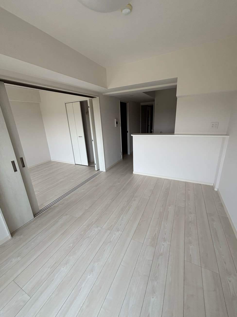 以前はダークブラウンの床や建具が重厚感を与えていましたが、全体をホワイトとペールグレー(淡い木目)で統一。光を反射する空間になり、同じ広さでも視覚的に「2倍広く感じる」ような開放感を生み出しました。