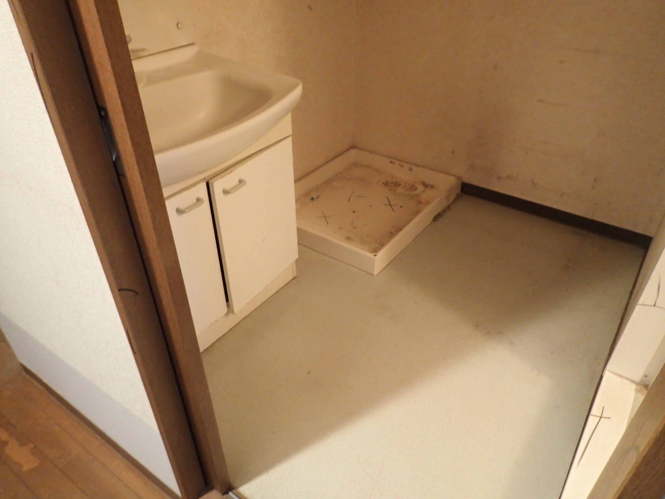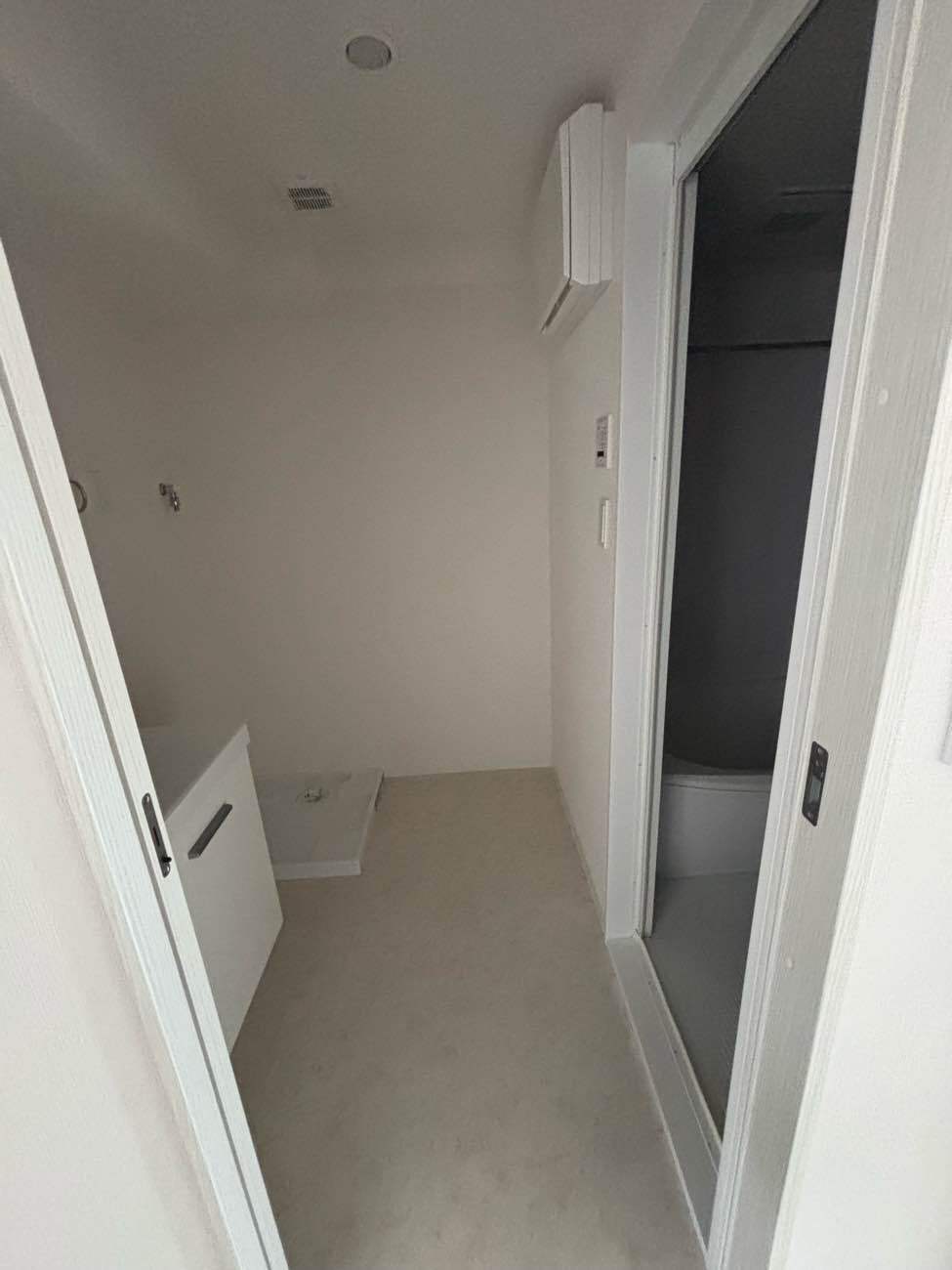 黄ばみや汚れが気になっていた洗濯パン(防水パン)を、真っ白な新品へ交換。洗面化粧台も、取っ手がフラットでシャープなデザインの最新モデル(ホワイト)に入れ替えました。毎日使う場所だからこそ、視界に入るノイズを極力減らし、ホテルのような非日常感を感じられる空間に仕上げています。
