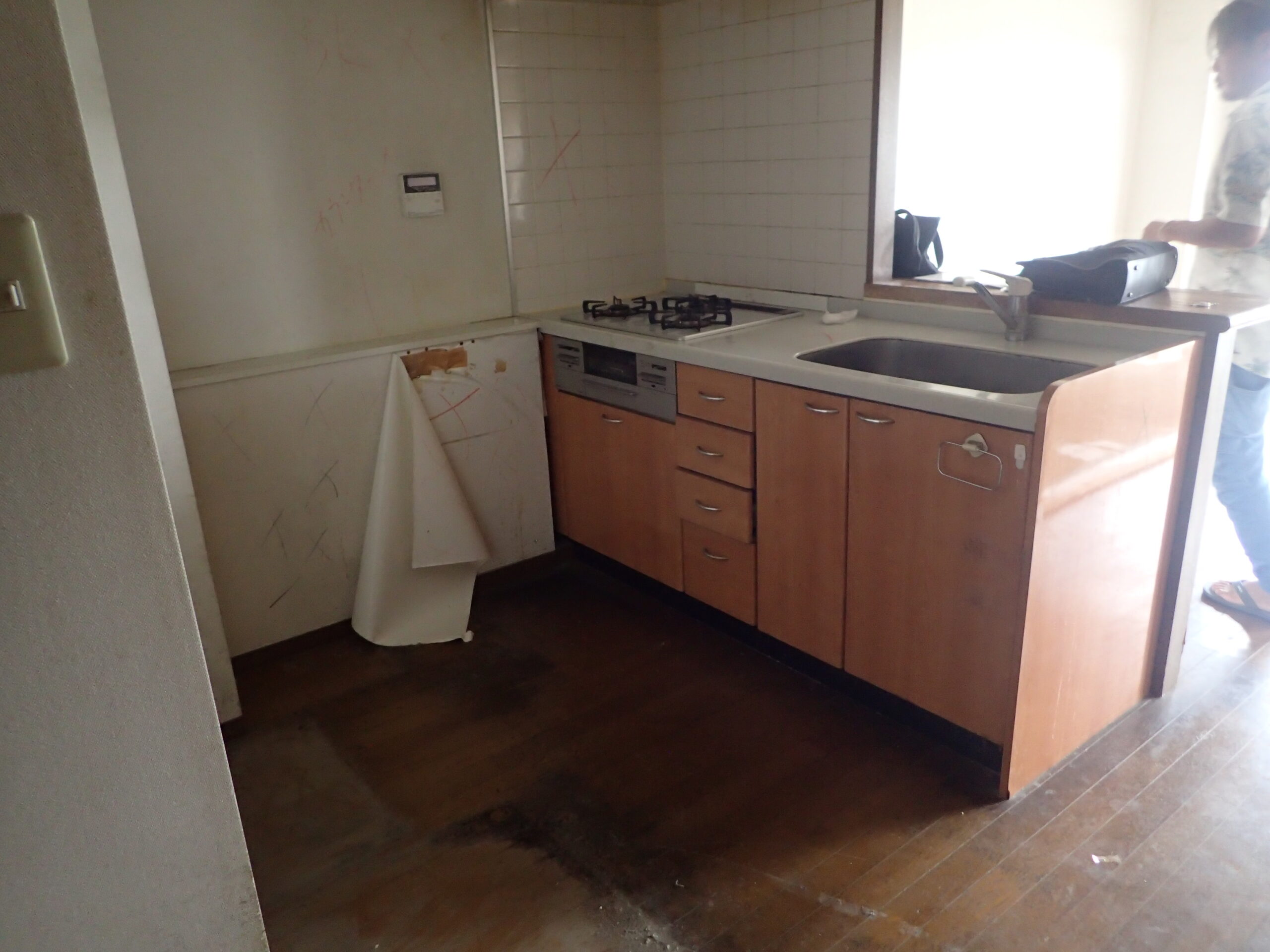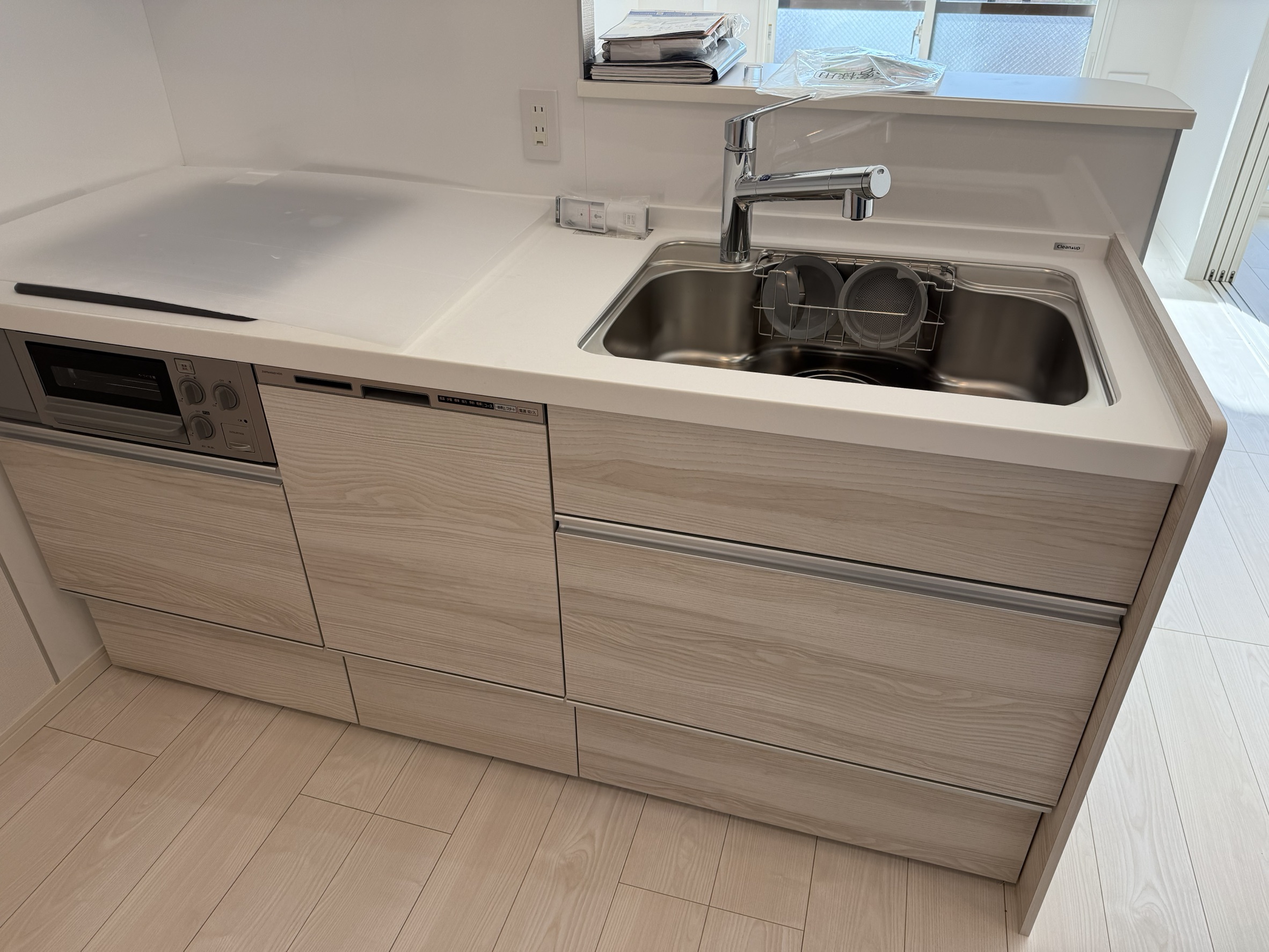 古さを感じさせていた木目調キッチンを一新。床色と合わせた「グレイッシュな木目調」のシステムキッチンを採用しました。リビング側から見ても家具のように馴染み、清潔感あふれる空間を演出しています。