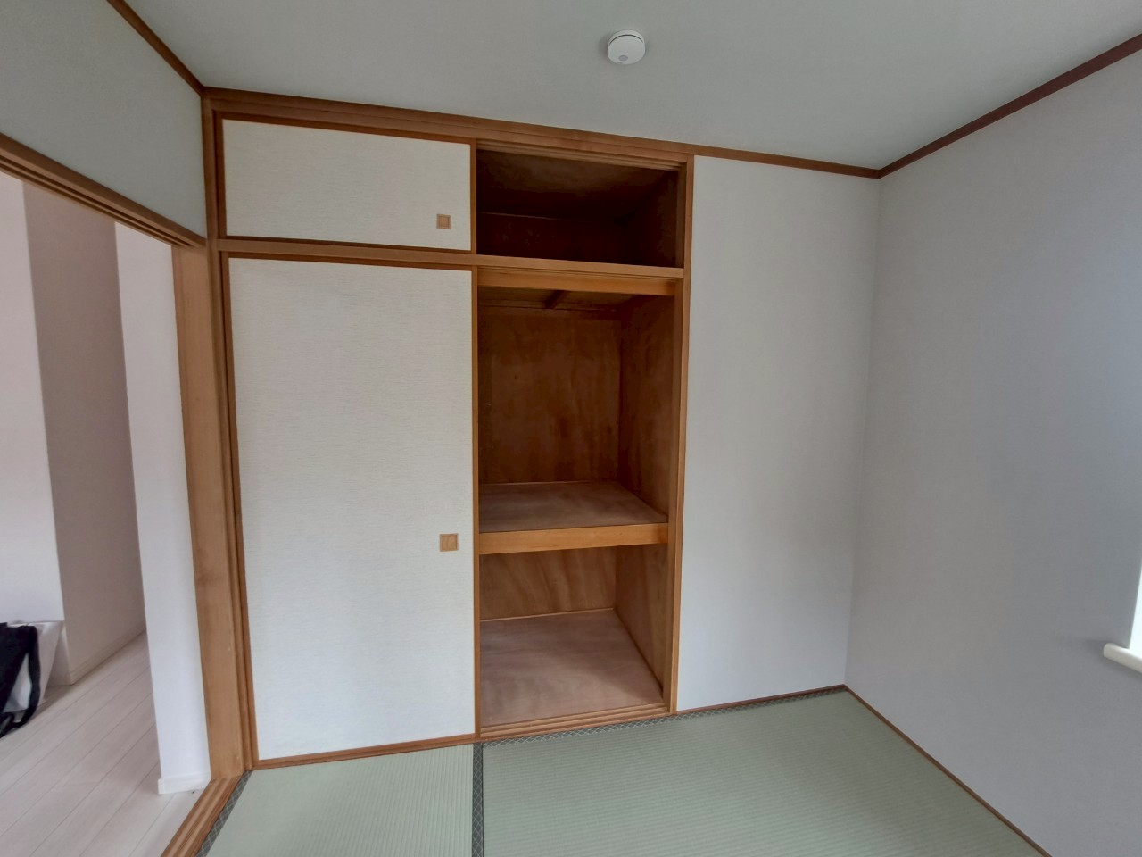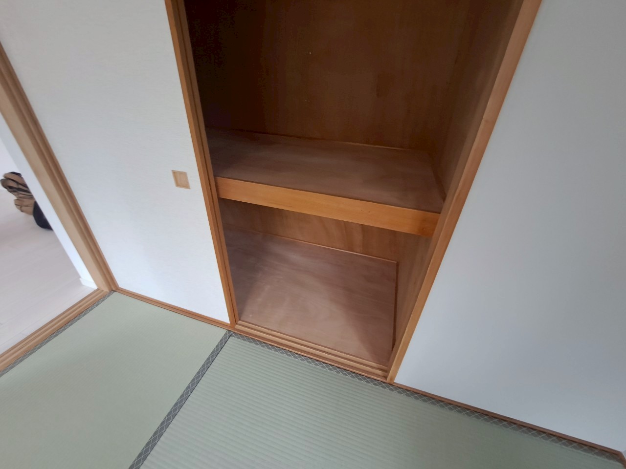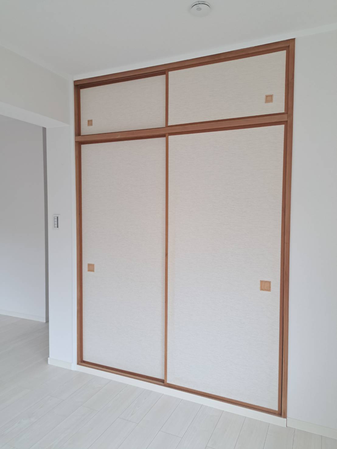 収納本体は既存のままですが、周りの壁紙(クロス)を真っ白にし、床をホワイトオークのフローリングに変更したことで、部屋全体の印象はガラリと変わりました。 枠などの木部が残っていても、周りが明るくなることで「古臭さ」が消え、ナチュラルなアクセントとして空間に馴染んでいます。