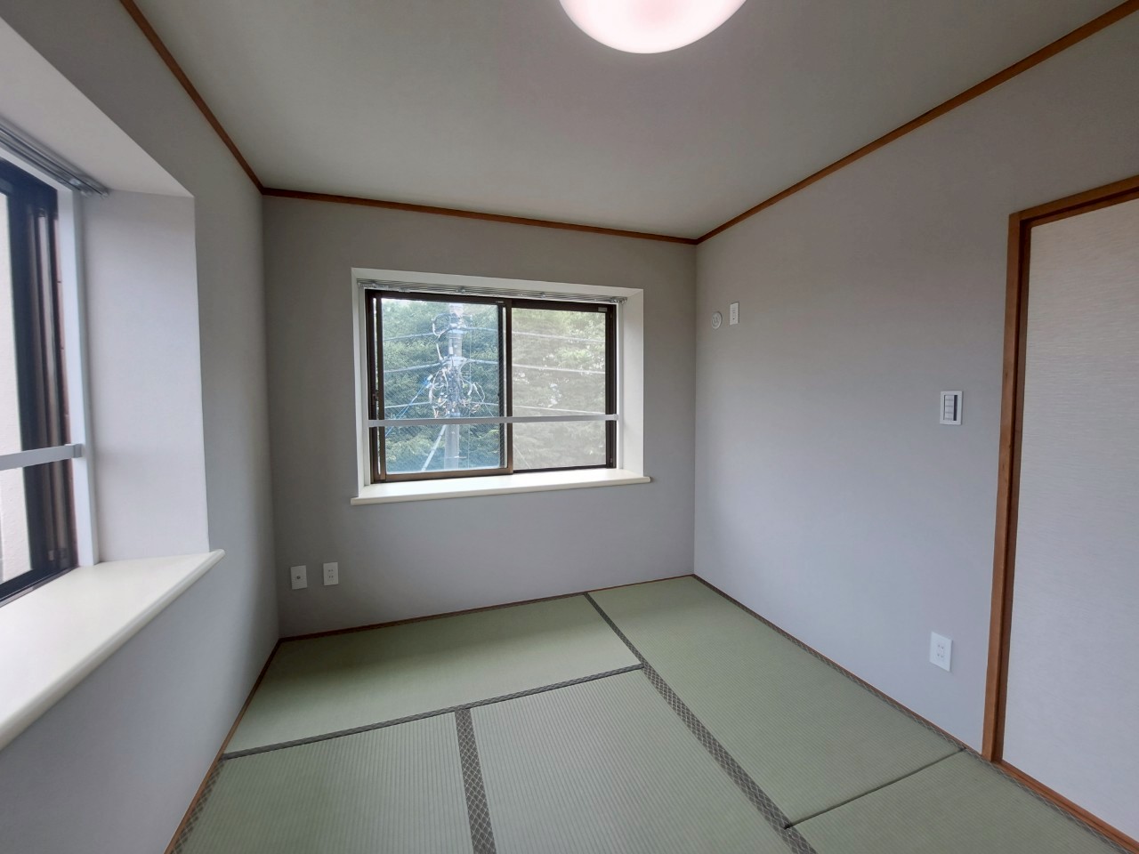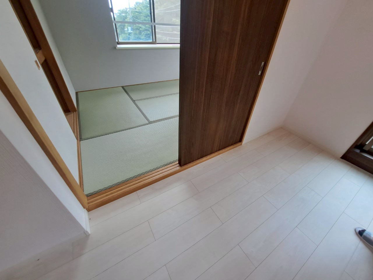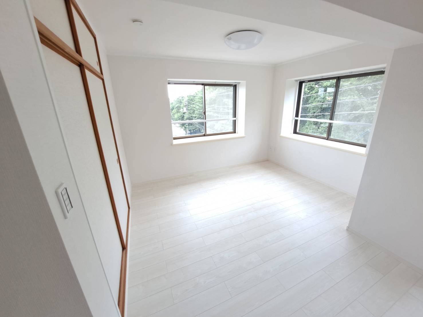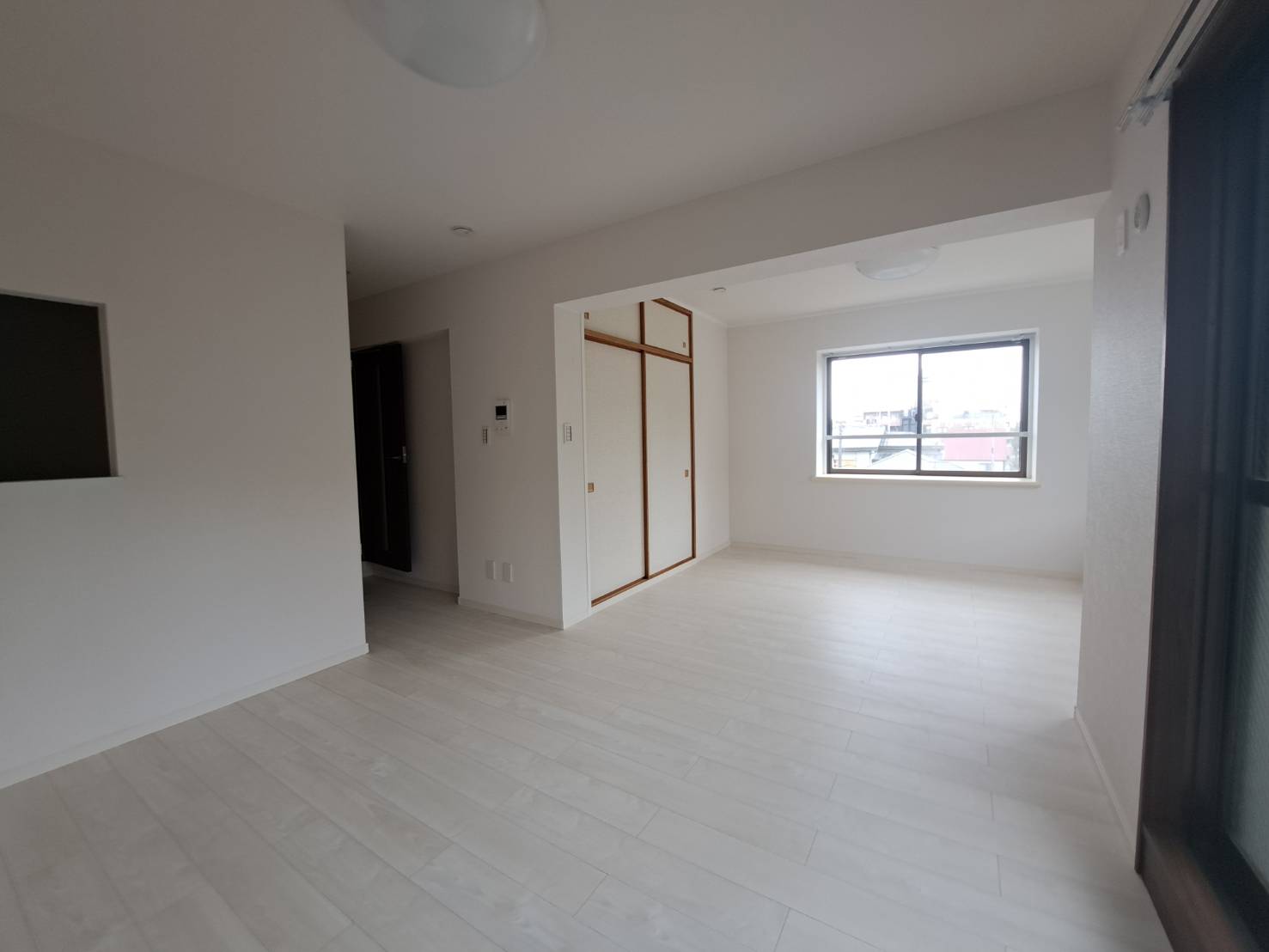 収納本体は既存のままですが、周りの壁紙(クロス)を真っ白にし、床をホワイトオークのフローリングに変更したことで、部屋全体の印象はガラリと変わりました。 枠などの木部が残っていても、周りが明るくなることで「古臭さ」が消え、ナチュラルなアクセントとして空間に馴染んでいます。