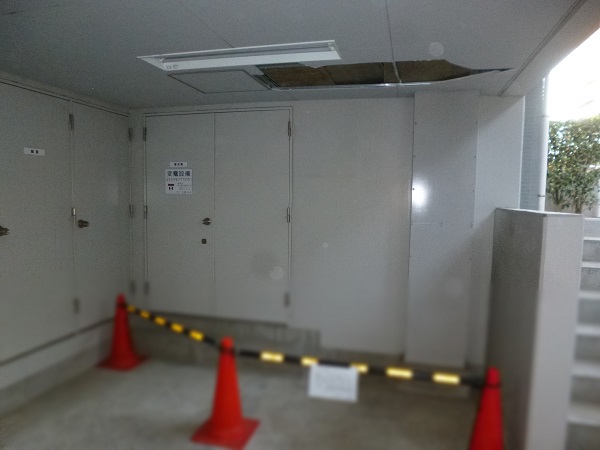 天井の石膏ボード3枚が割れて穴が開いている状態です。