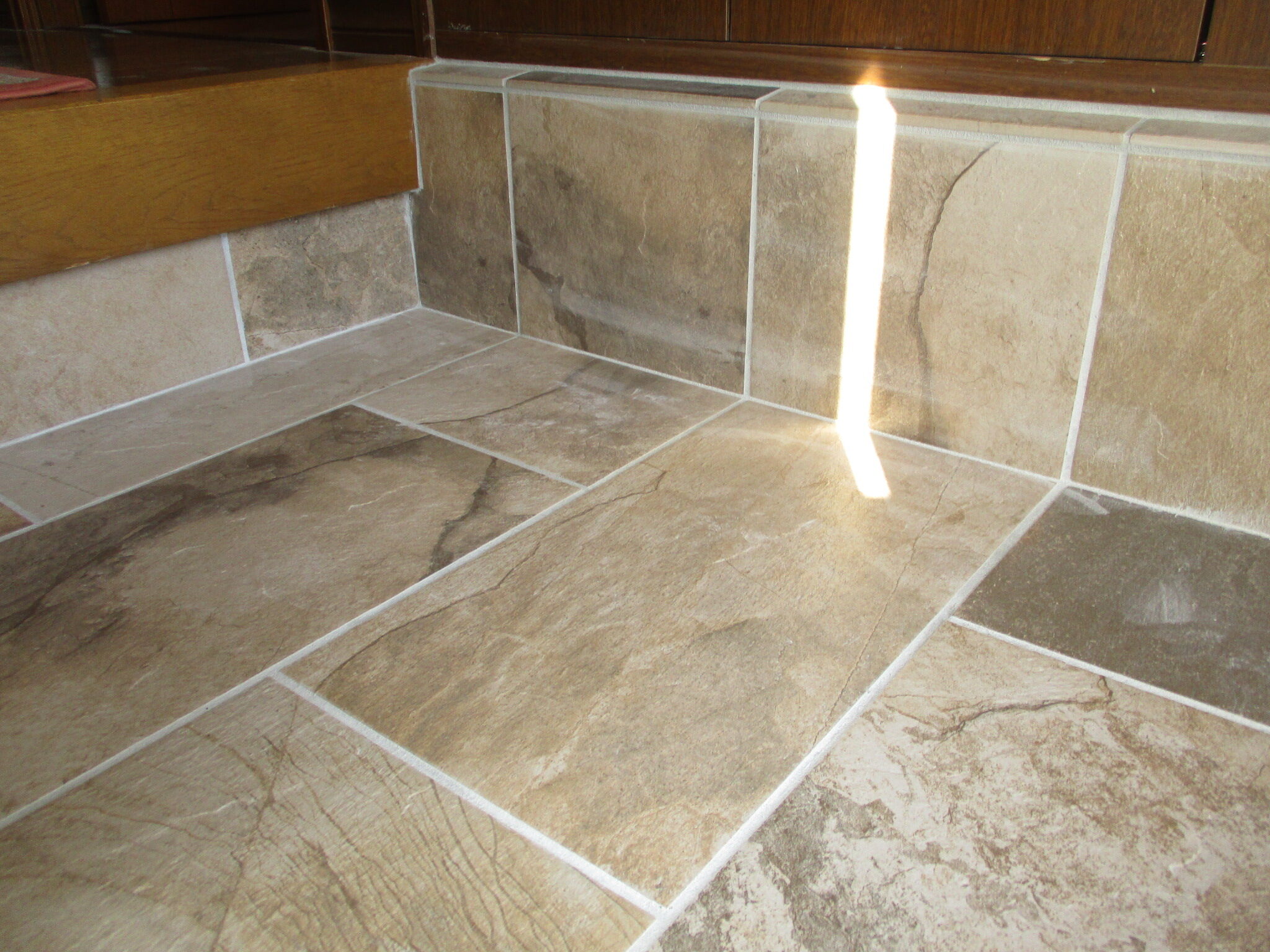 巾木部分まで丁寧にタイルを回し込み、隅々まで妥協のない手仕事で仕上げております。