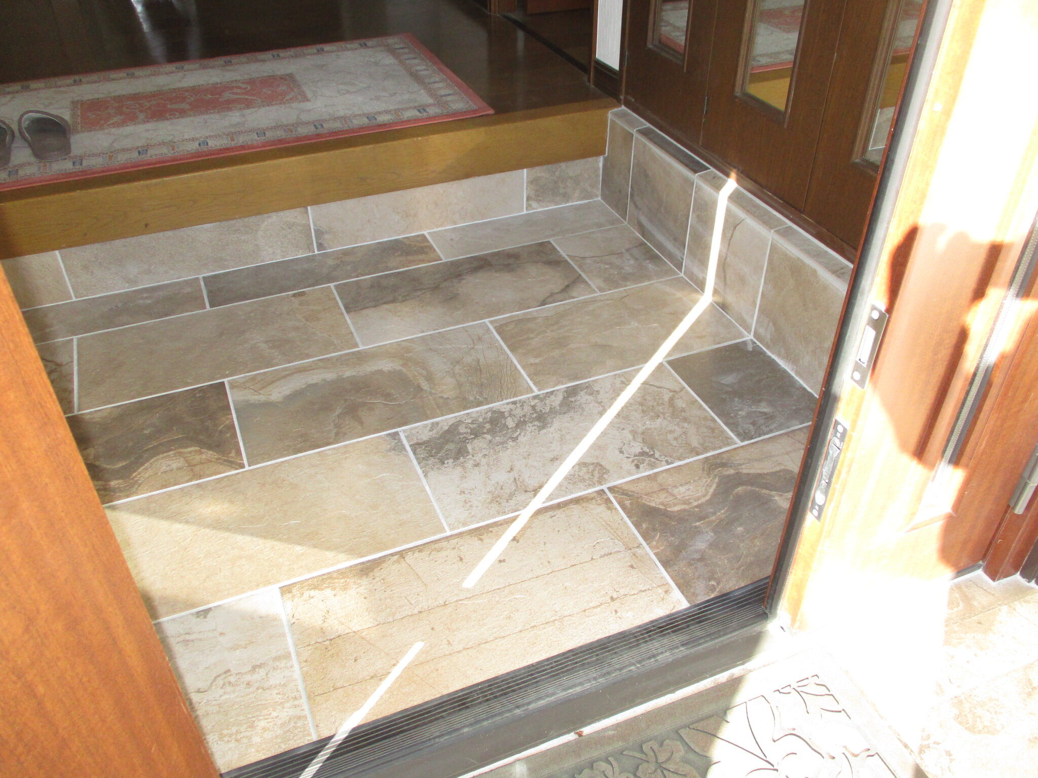 玄関内のタイルを新調したことで、扉を開けた瞬間に広がる清潔感が劇的に向上いたしました。今回採用したタイルの深みのある色合いが、室内のフローリングとも絶妙に調和しており、お住まいの重厚感を高めています。ミリ単位の目地調整により、歪みのない完璧な平面が構築されました。日々の靴の脱ぎ履きさえも楽しくなるような、贅沢な玄関空間の完成です。