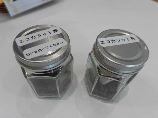 二つの瓶の中にコーヒー豆が入っていて、エコカラットが入った瓶と入っていない瓶のニオイを比べたところ、