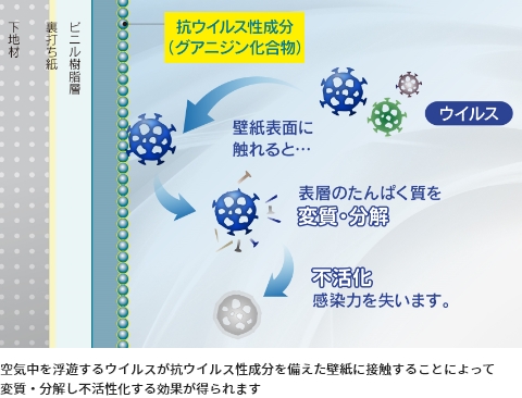 壁紙表面に塗布された抗ウイルス性成分(グアニジン化合物)が、ウイルス表層の
