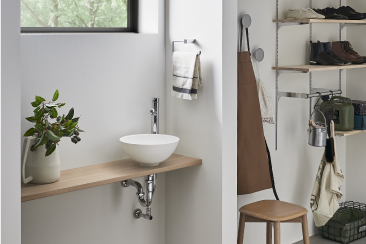 素材の魅力あるアイテムを自由に組み合わせて、玄関や廊下、トイレなどちょっとしたスペースに設置できるコンパクトな手洗です。