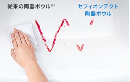 汚れが付きにくく落としやすい、TOTO独自の技術です。汚れを跳ね返し、サッとふくだけでキレイになります。
