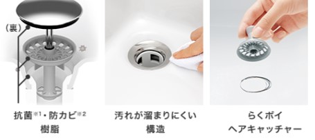 ※清掃不要になるものではありません。定期的なお手入れは必要です。 ☆排水口のフタ部分は、裏側が抗菌・防カビ仕様です。