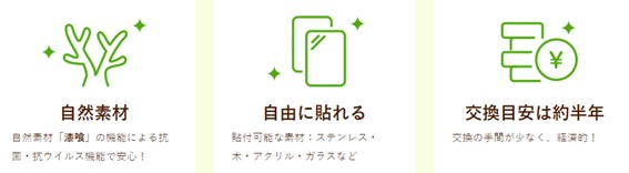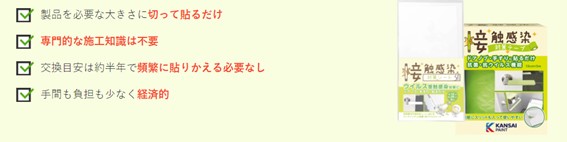 ドアノブや手すりなどの普段よく触る箇所に貼るだけで、接触感染対策が可能です。