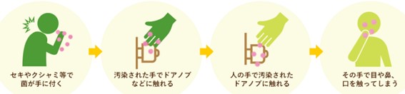 ◎間接接触感染は、汚染された媒介物の接触によって感染します。