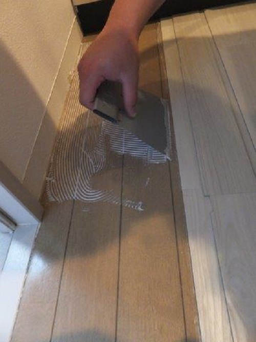 そして接着性が高まった頃合いを見て新しいフロアタイルを貼っていきます。