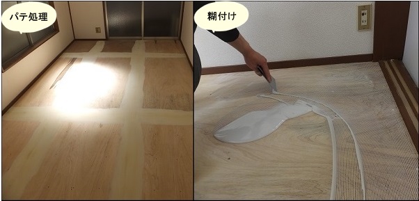 既存の床をはがしてから、下地の凹凸を平らにするために補修していきます。