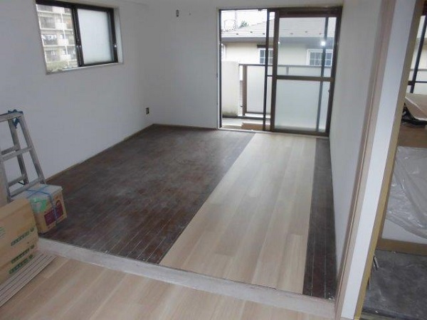 ベージュ系のフロアタイル施工が完了して、お部屋がこんなに明るい印象に