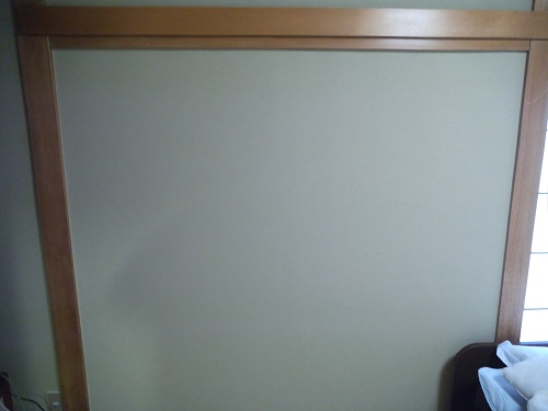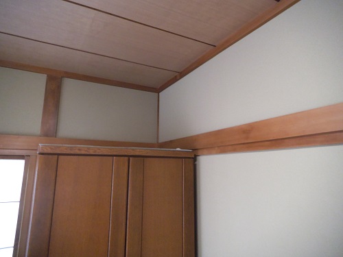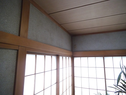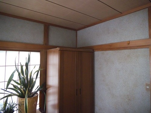 砂壁に直接ベニヤを張ってその上からクロスを張りました。