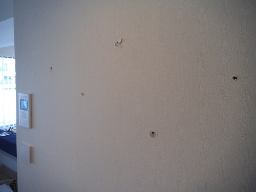 町田市の現場にて、お部屋の壁にあいてしまった穴の補修、クロス一面の張替え、ご希望のフック取付をおこなってきました!