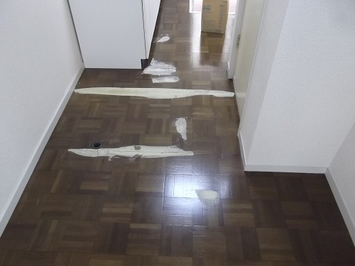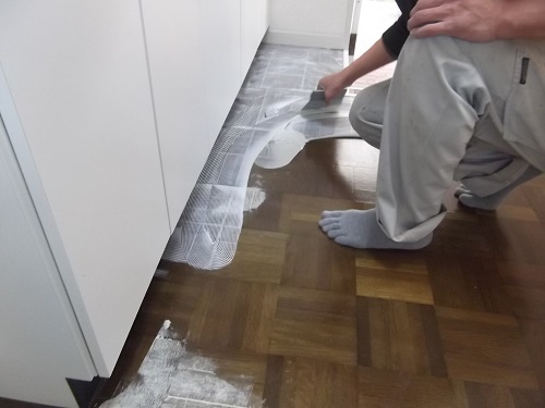 フローリング上貼りでしたのでまず掃除し、段差のある部分にはパテ処理をしていきます。