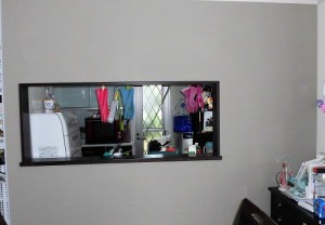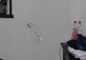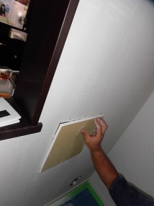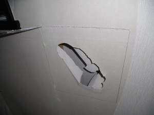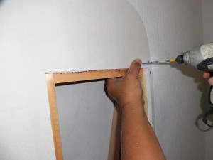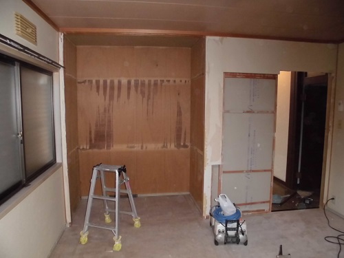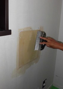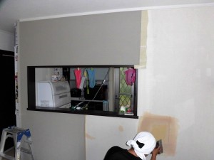 石膏ボードをはめ込み、ビスで固定、パテを縫ってならしていきます。