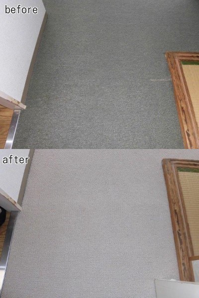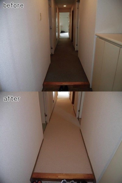 LDと繋がった廊下のカーペット、施工前と施工後の写真です。