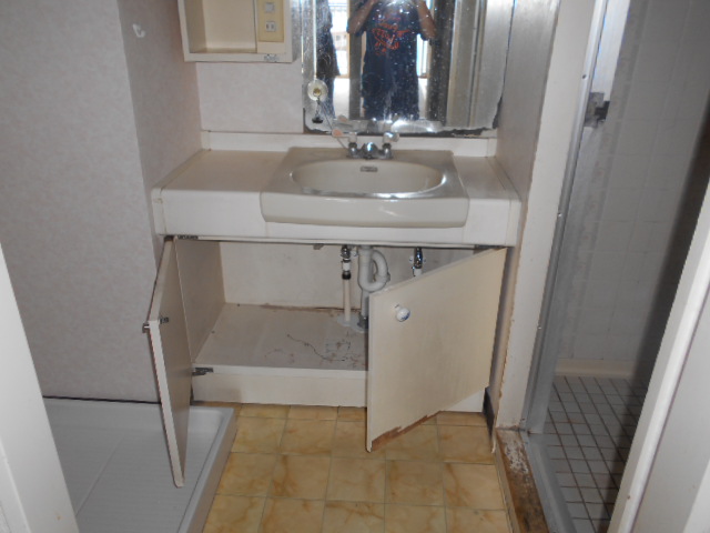 キャビネットのミラーは剥げ剥げ、観音開きの収納は扉や底板も傷んでいます。。。