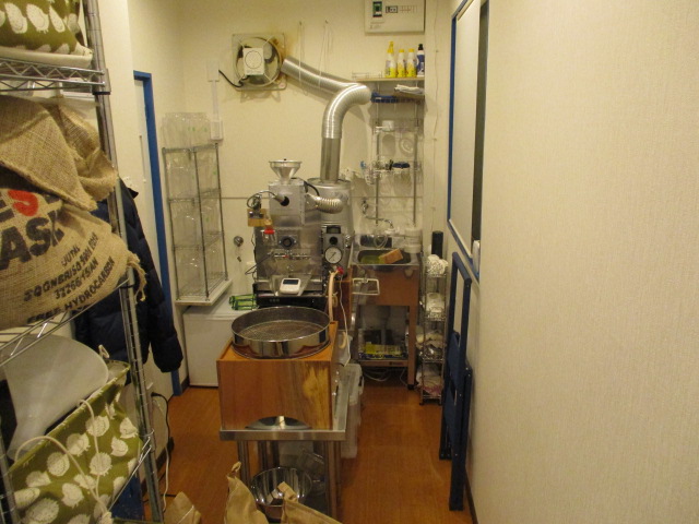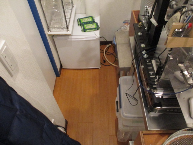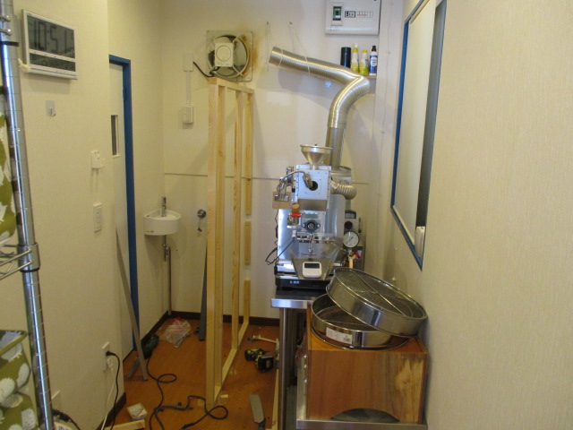 施工前の焙煎機周辺です。現在はオープンな状態ですが、ここに新しいシンクを設置するために、左側にしっかりとした壁を作る必要があります。