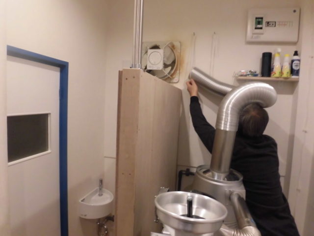 骨組みが完成した後は、表面の仕上げに入ります。垂木の骨組みにベニヤを貼り、分かりにくいですが手前には丁番で簡易ドアを設置致しました。奥に新設した手洗いが有ります。この簡易ドアは、清掃時やメンテナンス時に奥のスペースへ容易にアクセスできるようにするための工夫です。