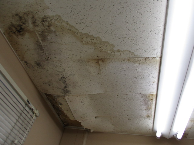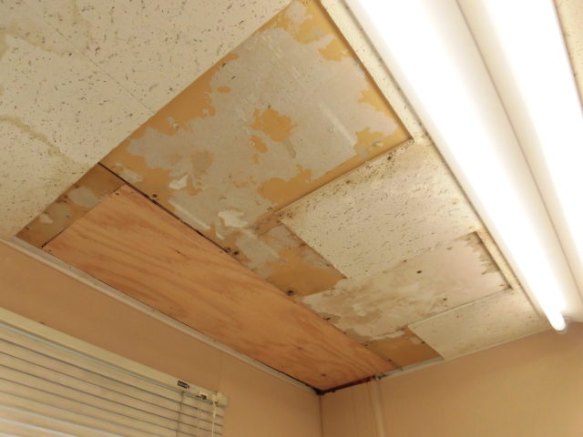 施工前。雨漏りによる岩綿吸音板の膨張と破損の現状