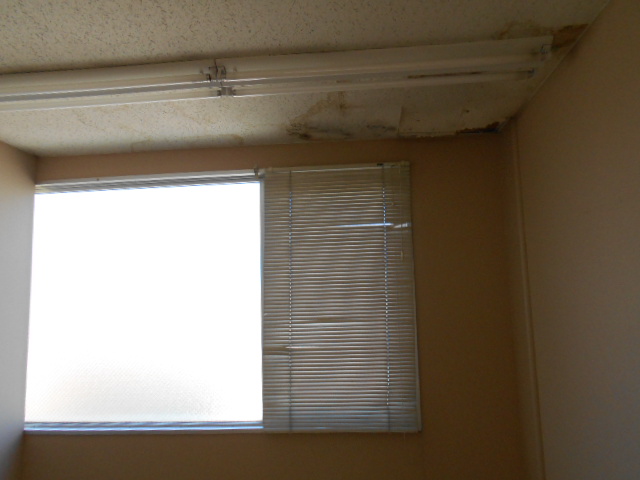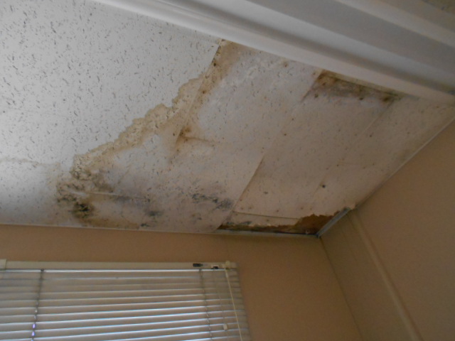 施工前の状態です。水が滴り落ちた跡がはっきりと残っており、天井材の強度が著しく低下していることがわかります。
