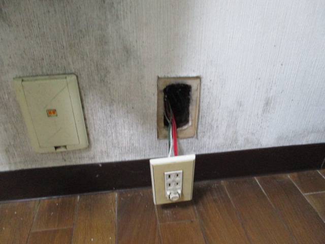 撤去前のコンセントです。かつての生活動線に合わせて設置されていましたが、現在の用途には不要となっていました。