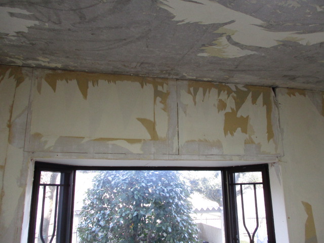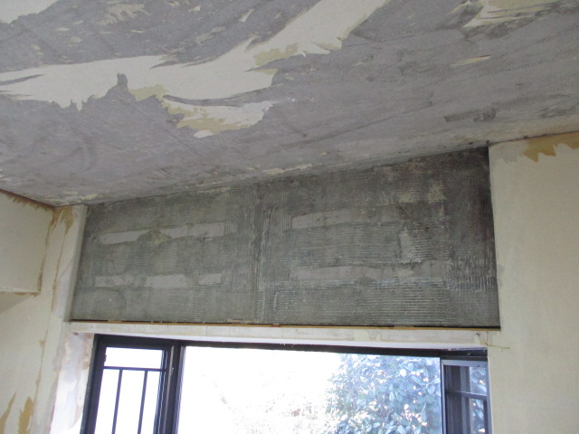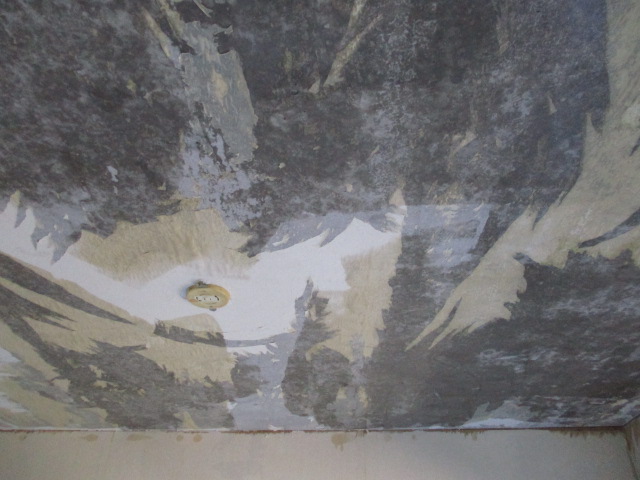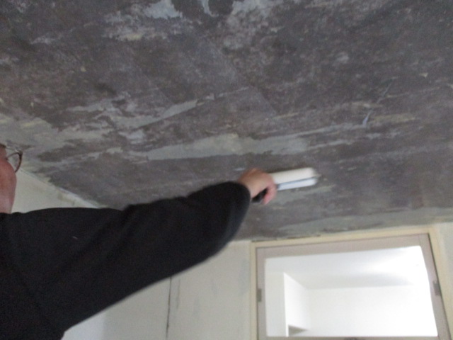 天井施工。コンクリート直貼りクロスの剥離とプライマー処理