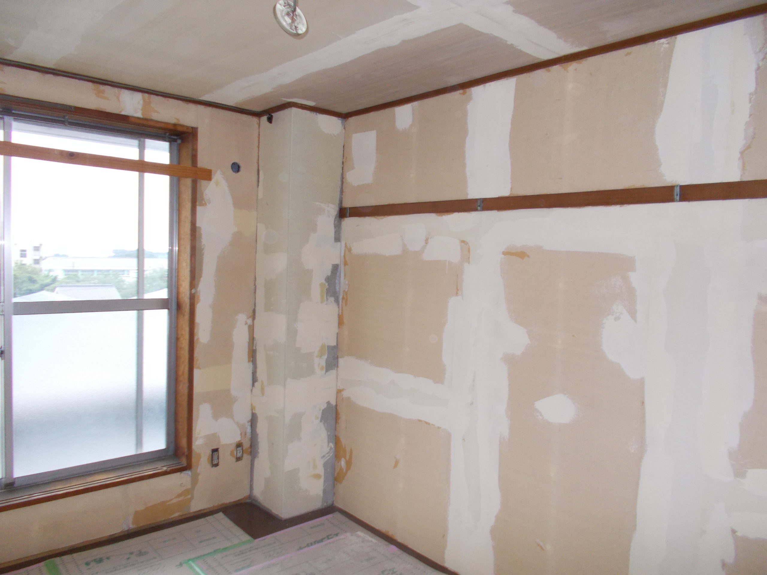 パテ処理の様子です。ヒビ割れた箇所や、石膏ボードの継ぎ目を、専用のコテを使って精密に埋めていきます。段差がなくなるまで何度も薄く塗り重ねるのが技術の基本です。
