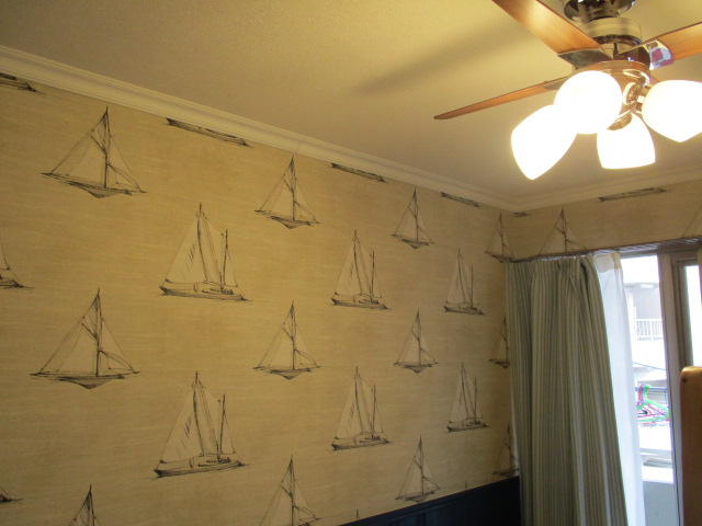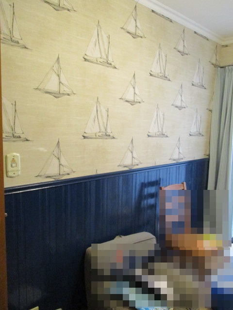 完成したお部屋の全景です。深いブルーの腰壁と、上部の華やかなクロスが絶妙なコントラストを生み出しています。