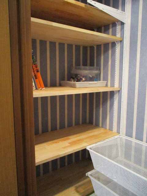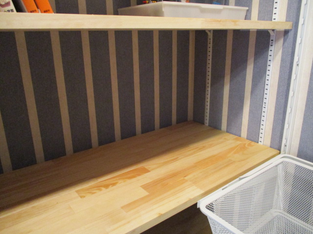 最後に、クローゼット内部のリニューアルについてご紹介いたします。以前の幕板とハンガーパイプを撤去し、新たに可動レールを設置いたしました。内部のクロスも張り替え、お部屋全体と統一感を持たせています。この可動レールは、棚板やハンガーパイプの高さを数センチメートル刻みで自由に変更できる優れものです。すっきり使いやすく、現在非常に人気の高い設備です。お子様の成長や、その時々の持ち物の量に合わせて、自分たちで簡単に段を切り替えられるのがいいですね。まさに、長く使い続けることができる持続可能な収納と言えます。