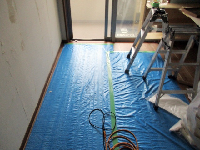 床一面に養生シートを敷き詰め、作業スペースを確保しました。安全かつ清潔に工事を進めるための重要な工程です。