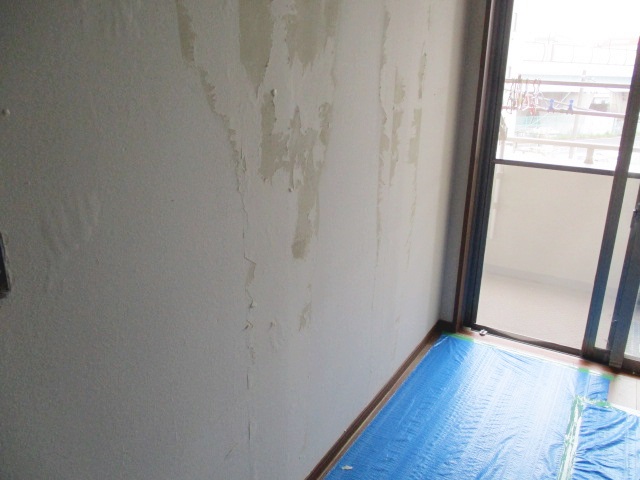 既存の壁紙を剥離している様子です。下地を傷めないよう、適切な角度と力加減で慎重に作業を進めます。