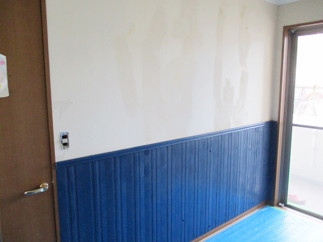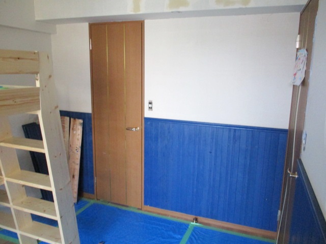 羽目板の上には見切り板を設置します。この見切り板は、腰壁と上部のクロスの境界線を美しく整えるとともに、羽目板の断面を保護する役割も持っています。今回の見切り材も、腰壁と同じロイヤルブルーの素敵な色で統一いたしました。この強烈ながらも深みのあるブルーが、お部屋に気品と落ち着きをもたらします。腰壁を設置することで、将来的に壁の下部が汚れたり傷ついたりしても、木材であれば修復が容易であり、ビニールクロスだけの場合よりも格段に長持ちするお部屋となります。こうした実用性と意匠性の両立が、松美装のリフォームの提案力です。