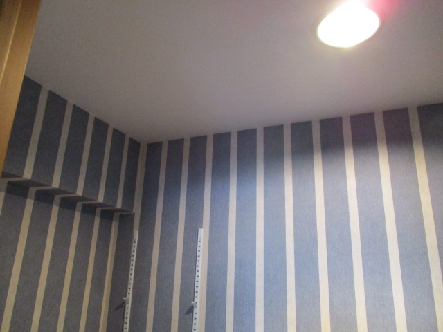 壁クロスは御支給品でした。とてもおしゃれな柄のクロスで、羽目板との相性も素晴らしいですね。ここで特に注目していただきたいのが、クロスのつなぎ目です。このクロスのような柄物の模様合わせは特に繊細な作業なので、熟練の技術者による施工なら安心です。柄の繰り返しであるリピートを正確に計算し、隣り合うシート同士の模様が1ミリのズレもなく繋がるよう、高度な裁断と張り込みを行いました。近くで見てもどこが継ぎ目なのか全くわからない仕上がりは、私たちの誇る手仕事の結晶です。支給品のクロスは、予備が限られていることも多いため、一発勝負の緊張感の中で完璧な作業を完遂いたしました。