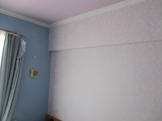 工事の第一歩は、お住まいを汚さないための徹底した養生から始まります。しっかり床に養生をし、壁紙を剥がしていきます。特に今回のような全面的な張替えでは、剥がしたクロスの破片や下地の粉塵が大量に発生するため、床面を完璧に保護することが不可欠です。その後、古いクロスを丁寧に剥がし、石膏ボードの下地状態を点検いたします。剥がした跡に残る裏紙の浮きや、ボードの継ぎ目の段差をパテで平滑に整えることで、新しいクロスが美しく張り上がるための土台を築きます。