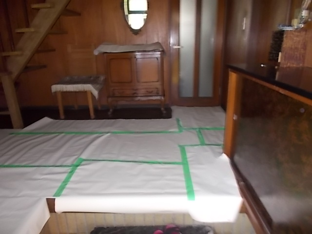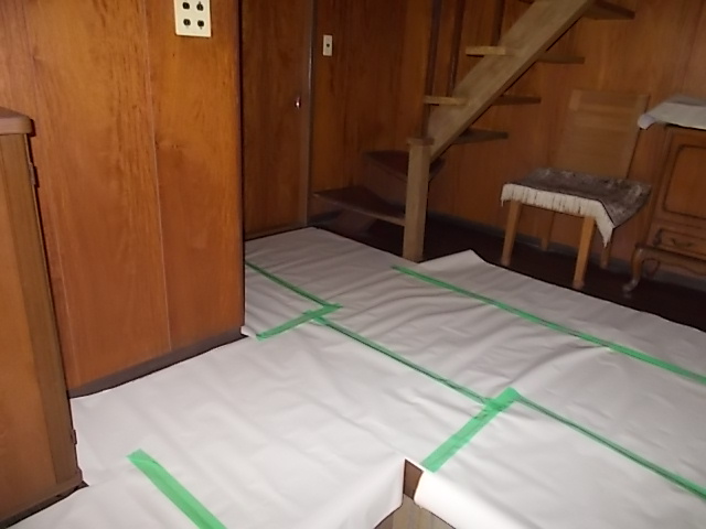天井クロスの張り替えは、重力に逆らって行う作業となるため、壁の施工よりも高度な準備と技術が求められます。まず最初に行うのは、お客様の大切な家具や床を守るための養生作業です。施工前に床に養生を施します。天井の作業では、古いクロスの裏側に溜まった埃や、剥がした際の破片が大量に降り注ぐことになります。そのため、隙間なくブルーシートや養生マスカーを展開し、工事後の清掃まで考慮した完璧な防御壁を作り上げます。