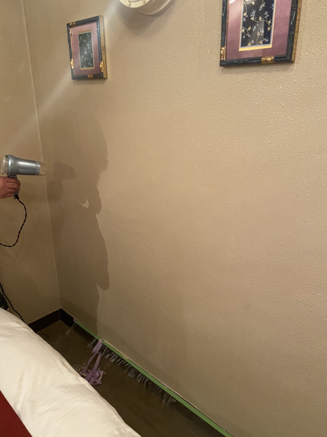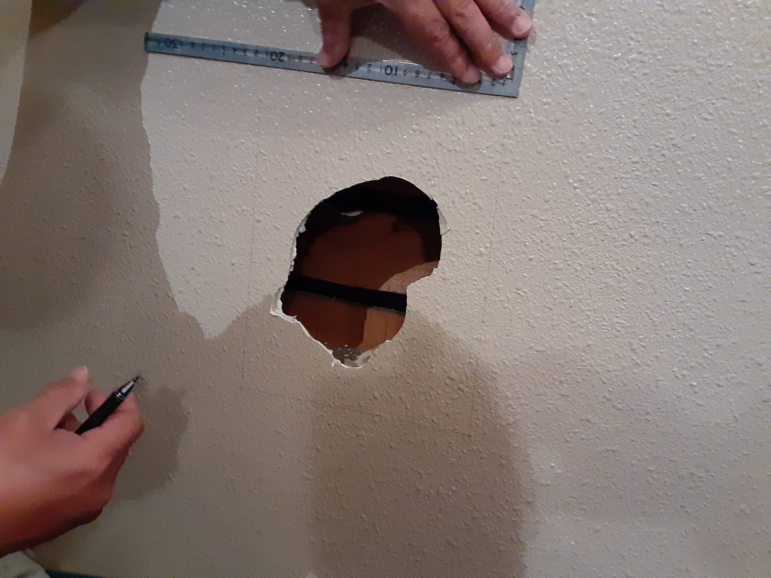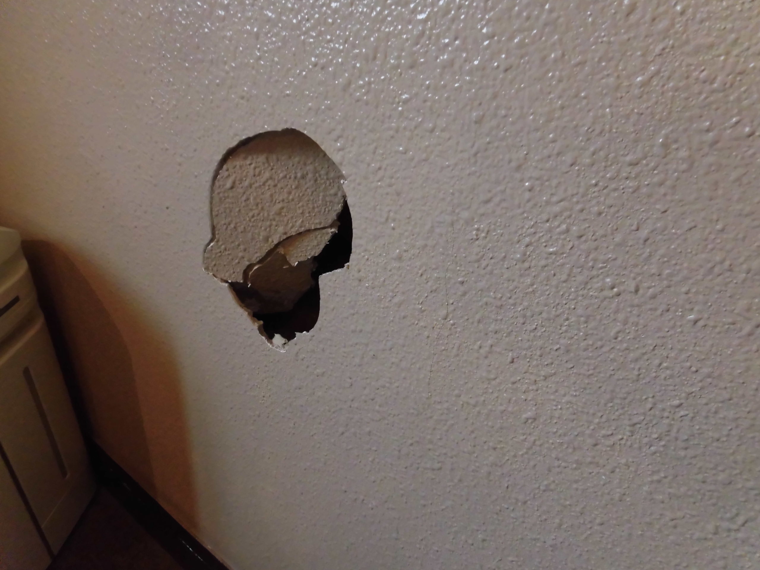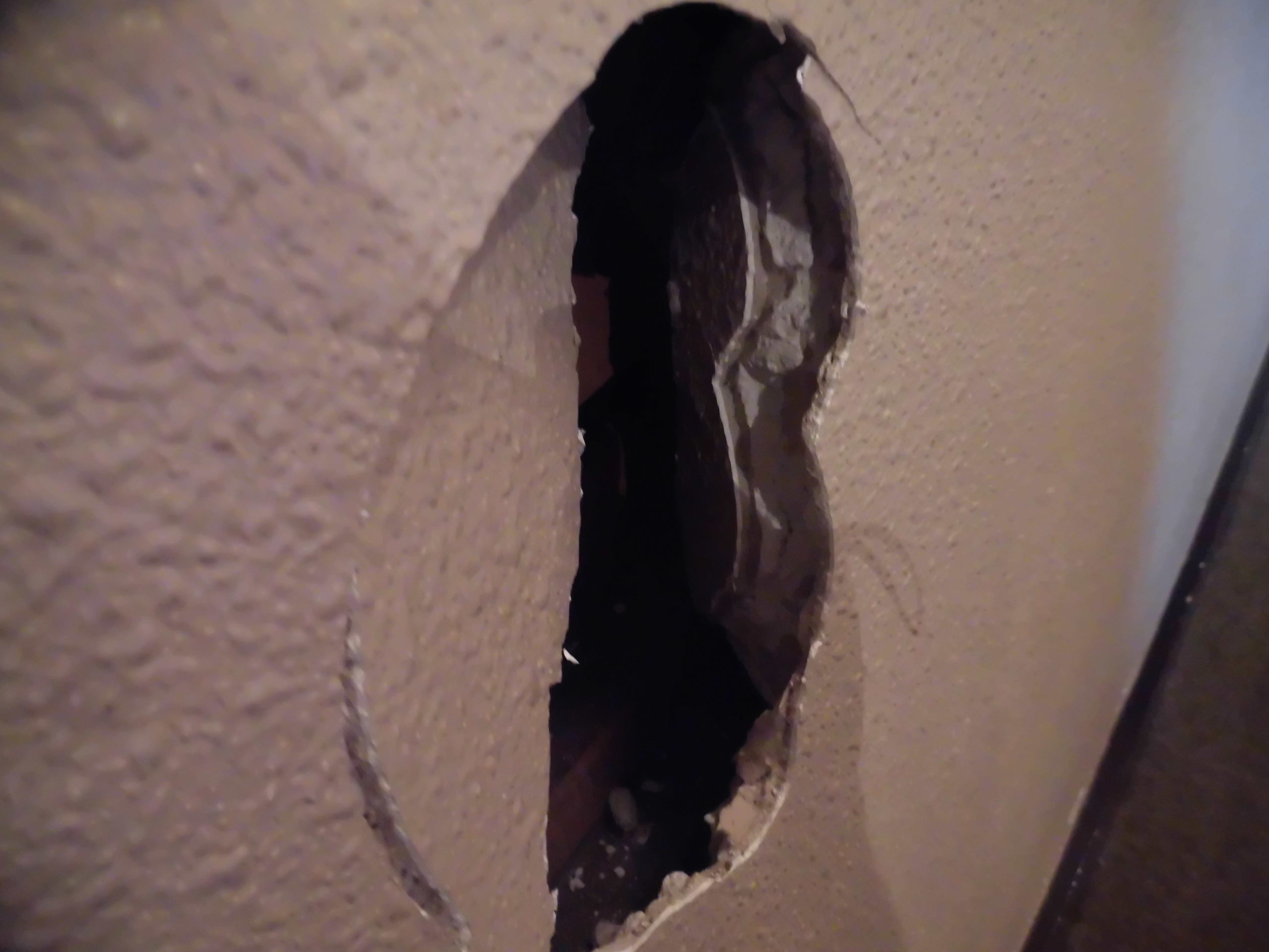 塗装された壁の中央付近に、大きな衝撃を受けた形跡のある壁穴が確認できます。