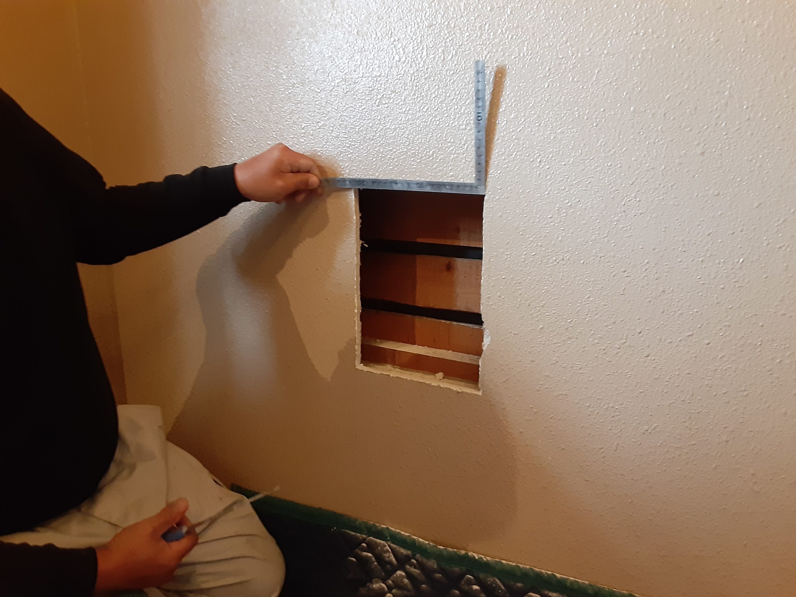 職人は、破損部を中心に、垂直と水平が完全に出るように四角いガイドを引き、それに沿ってボードを切り抜いていきます。このとき、切り抜いた穴の向こう側は空洞になっているため、そのままでは新しいボードを固定することができません。そこで、新しいボードを張る為下地となる垂木を入れていく工程に入ります。