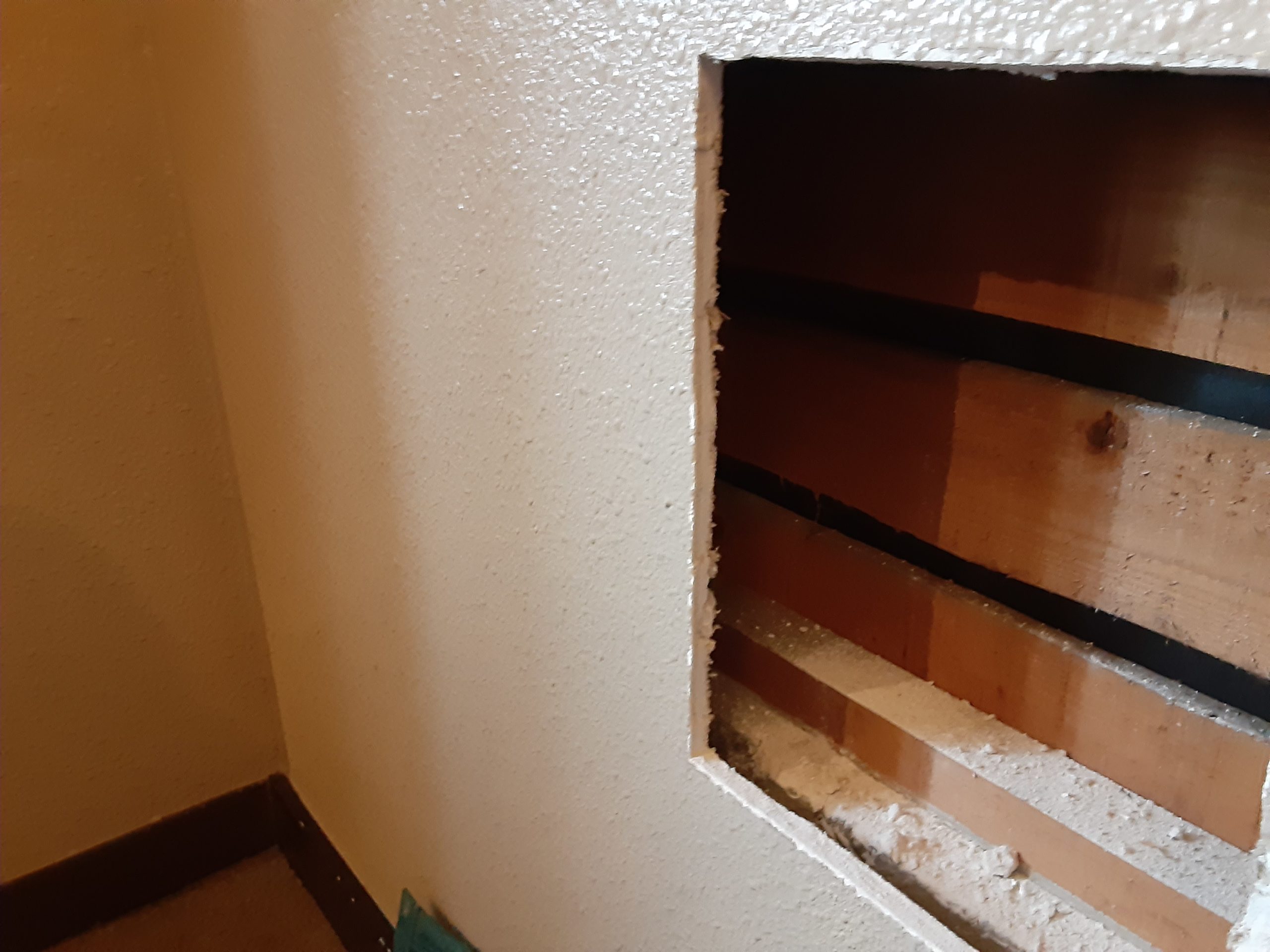 専用のカッターを使用し、補修の為ボードを四角く切り抜きました。内部の柱が見えています。