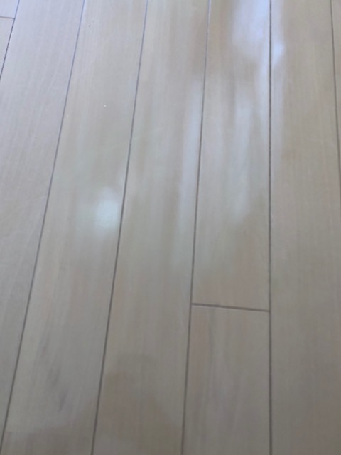 フローリングの表面が毛羽立つように削れており、光の加減で非常に目立っています。