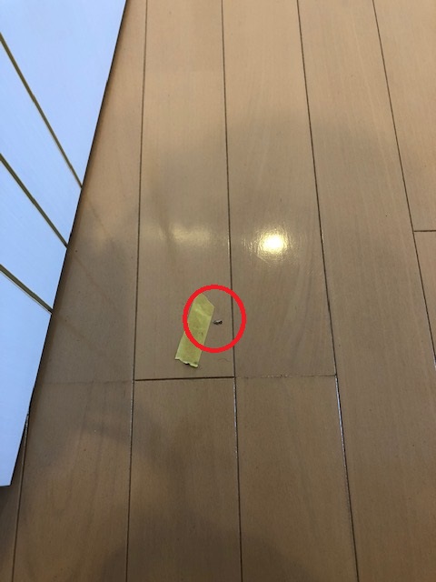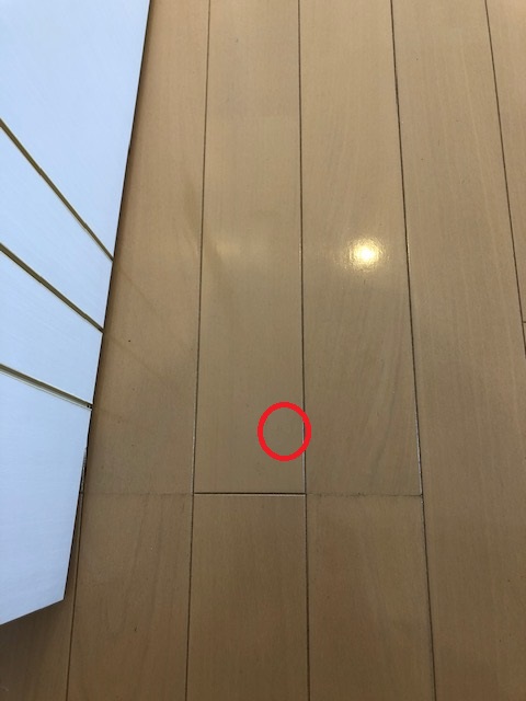 続いて二件目の事例です。こちらは一点に強い力が加わったことで、床材が深く陥没してしまった打痕のケースです。