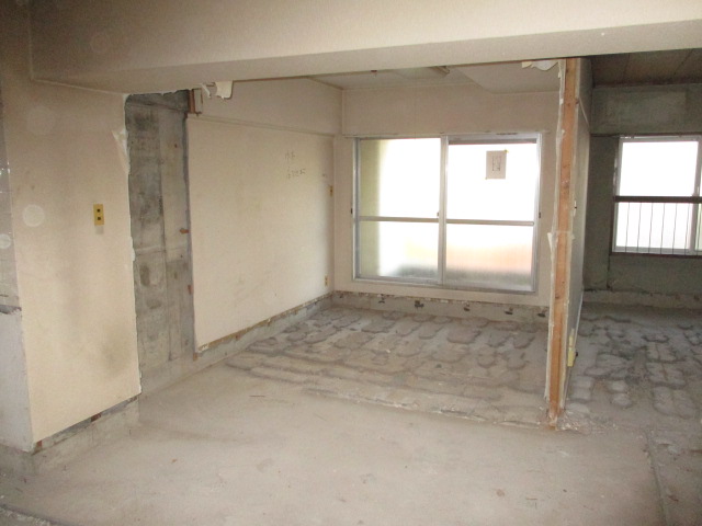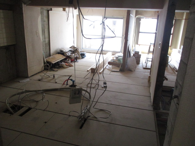 畳をすべて上げ、壁を剥がし、天井を取り去ると、マンションの躯体であるコンクリートや軽量鉄骨の柱が姿を現します。和室と洋室を隔てていた壁も撤去することで、一つの広大な空間が生まれました。和室を洋室に変更する場合、畳の厚みとフローリングの厚みが異なるため、床の高さを合わせるための調整が非常に重要になります。解体後に露出した地盤の状態を確認し、水平を保ちながら強固な土台を組む準備を整えました。