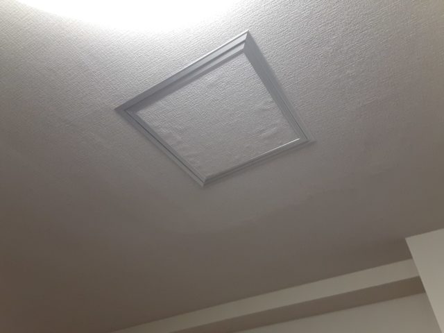 下地処理が完了した天井全体に、新しく選定した清潔感あふれるクロスを張り上げました。そして最後に、最新の点検口枠を設置して完了となります。